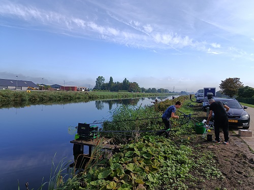 De deelnemers maken zich gereed voor het Open Nationaal Kampioenschap Dobbervissen Heren 2023.Bijzonder moment