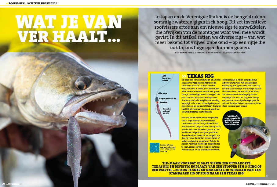 In Japan en de Verenigde Staten is de hengeldruk op sommige wateren gigantisch hoog. Dit zet inventieve roofvissers ertoe aan om nieuwe rigs te ontwikkelen die afwijken van de montages waar veel mee wordt gevist. In dit artikel zetten we diverse rigs – van wat meer bekend tot vrijwel onbekend – op een rijtje die ook bij ons hoge ogen kunnen gooien. Check het artikel voor meer informatie en uitleg over de Texas rig, Sasuteki rig, Kickback rig, Free rig, Hover rig en Inu rig.