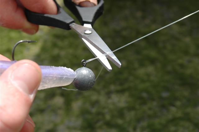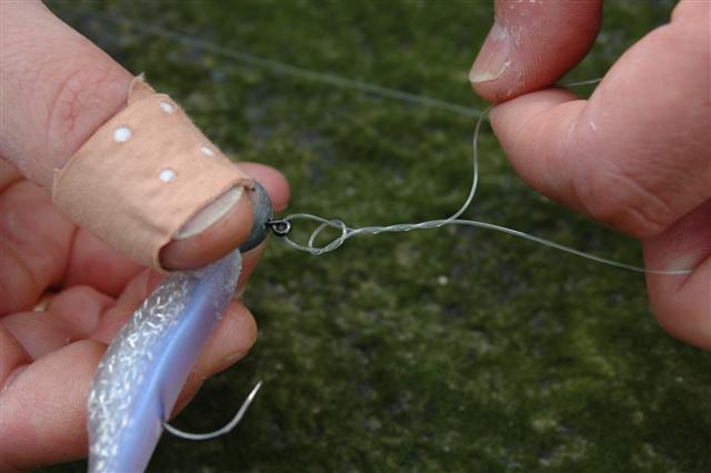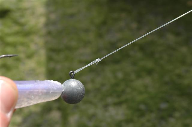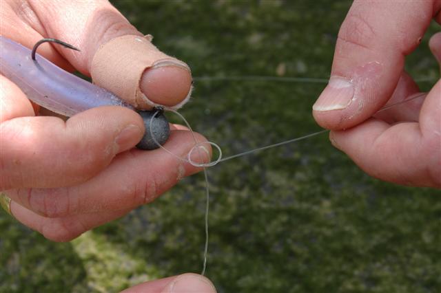 Stap 1: Leg een eenvoudige knoop in het uiteinde van je voorslag en haal de lijn door het oog van de loodkop.