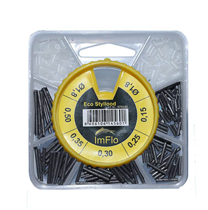 Het Eco Styllood is verkrijgbaar in een verdeeldoos ‘middel’ en ‘groot’. Beide kosten slechts een paar piek en bevatten plenty ijzeren staafjes in vijf gewichtjes: van 0.15 tot 0.5 gram. Voordat je je dobber kunt ‘uitloden’ schuif je eerst de meegeleverde tubes op je lijn – altijd een even getal, want voor elk gewichtje heb je twee van deze doorzichtige rubbertjes nodig. Daarvan schuif je er een over de boven- en een over de onderkant, waarna het staafje gefixeerd zit. Je hoeft het Styllood dus niet aan te knijpen met een tangetje, je tanden of je vingers om dit vast te zetten.