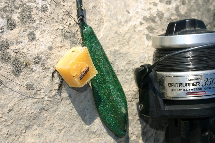 Oude kaas is zonder twijfel het beste aas voor barbeel. Bevestig een blokje ter grootte van een dobbelsteen net als een boilie op de hair zodat de haak helemaal vrij is. De onderlijn mag tussen de 20 en 30 centimter lang zijn en minimaal 25/00 dik. Werp je montage altijd vol in de stroming, want daar vind je absoluut de meeste barbelen. Kies voor lood dat goed in de stroming blijft liggen, zoals bovenstaand earodynamisch gevormde lood van 110 gram.