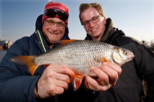We hebben deze reportage zo lang mogelijk proberen te rekken in de hoop op mooi weer, maar ook eind maart is het nog veel te koud voor de tijd van het jaar. De deadline wijkt echter niet, dus sta ik met Dennis in een ijzige oostenwind aan de IJssel bij Nieuwerkerk. Hij kijkt mee als ik een heavy feederhengel van vier meter lengte optuig met een snelle en krachtige medium-zware werpmolen en – gezien de sterke stroming – een voerkorf van 80 gram. Bij een oefenworp op zo’n 50 meter afstand, komt de korf muurvast te zitten; waarschijnlijk aan mosselen op de rand van de vaargeul. Na nog wat oefenworpen, waarbij ik tel hoeveel seconden de korf er over doet om de bodem te raken, vind ik op circa 30 meter een obstakelvrij talud.