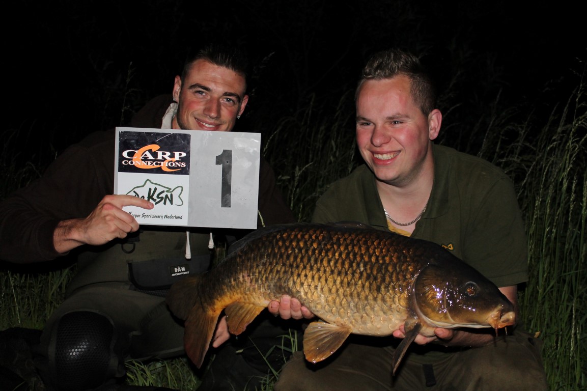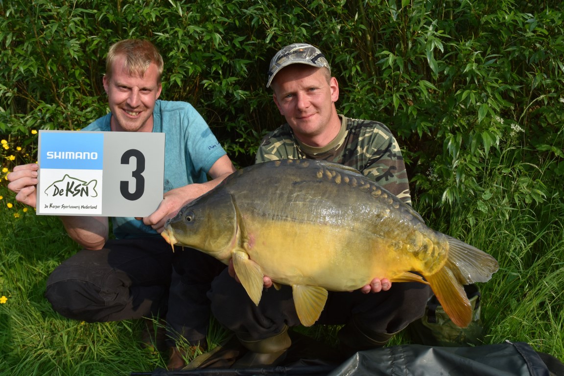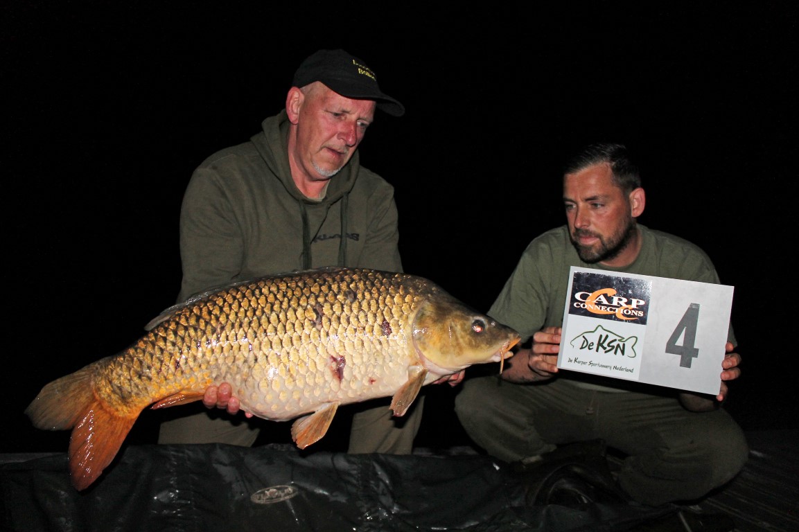 Zaterdagnacht en zondagochtend werden nog drie vissen gevangen: spiegelkarpers voor Henri & Henk en John & Ricardo en een schubkarper voor Erik & Maik.