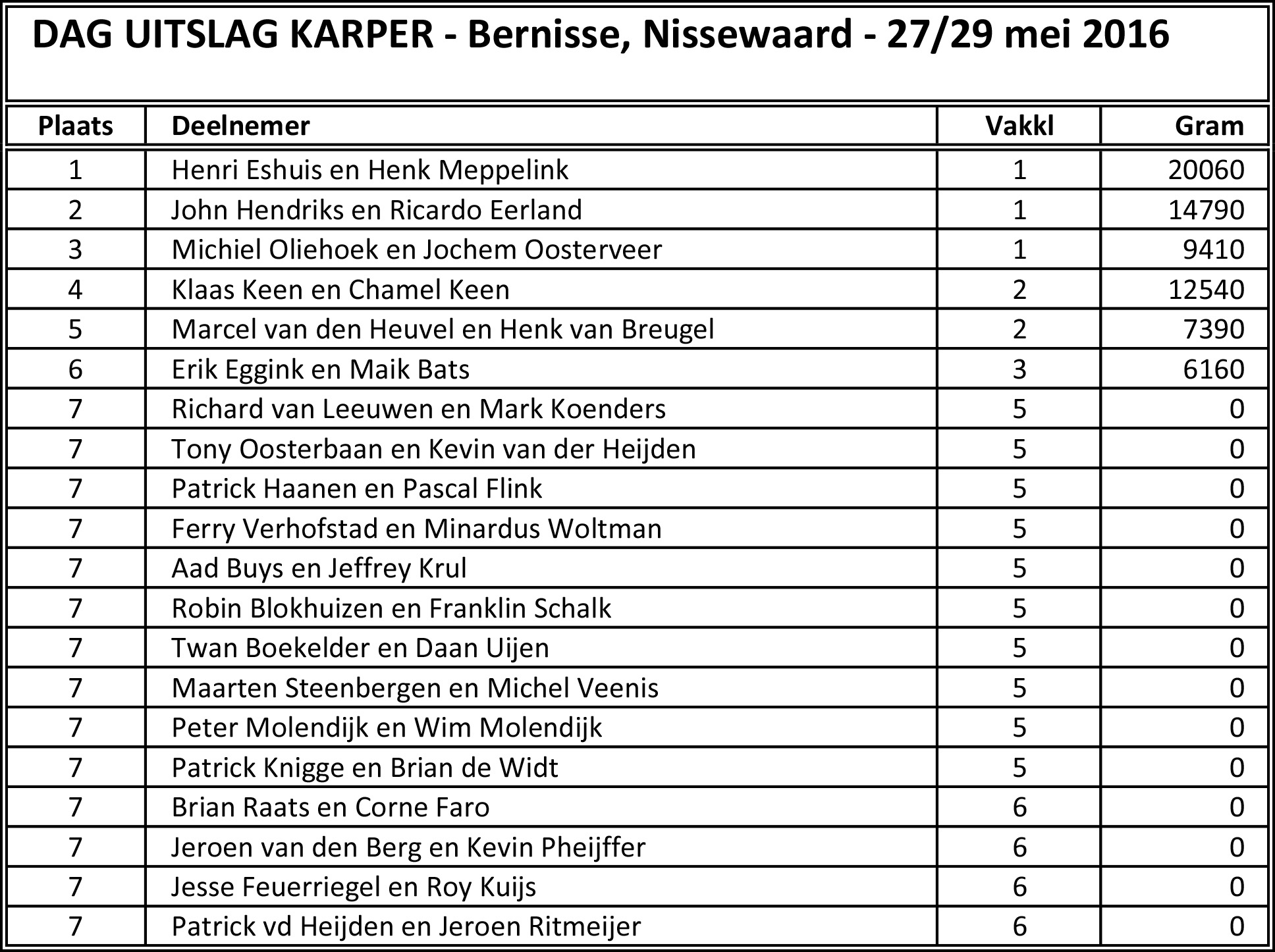 Hieronder is de uitslag van de wedstrijd aan de Bernisse en het tussenklassement na twee wedstrijden weergegeven, gevolg door enkele foto's van de Bernisse en de prijsuitreiking.