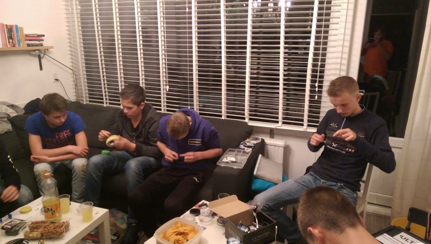 Vrijdagmiddag 28 oktober stonden deelnemers al te trappelen om te beginnen aan het trainingsweekend in Westkapelle. Na de kennismaking kwamen al snel de dozen met onderlijnmaterialen op tafel en werd er lustig op los geknoopt. Iedereen kwam wel even bij elkaar kijken hoe men zijn onderlijntjes maakte. De ene knoopte en de andere was aan het lijmen. Zo werden er diverse lijnen geknoopt die men zaterdag uitvoerig zou gaan testen.