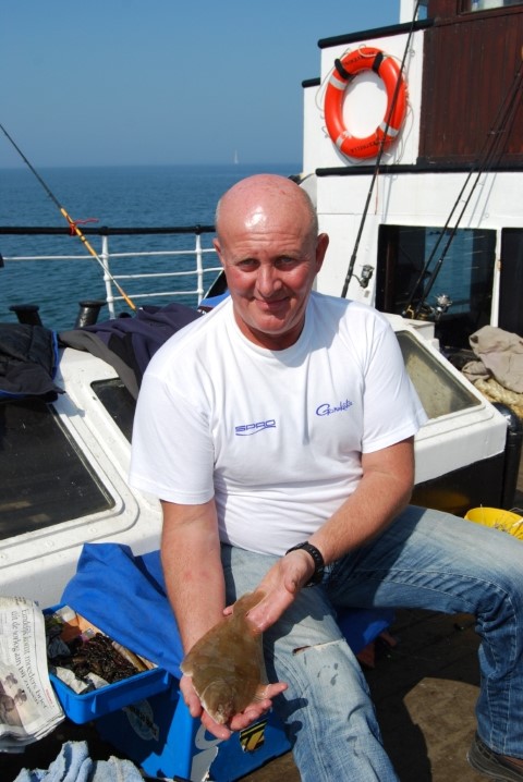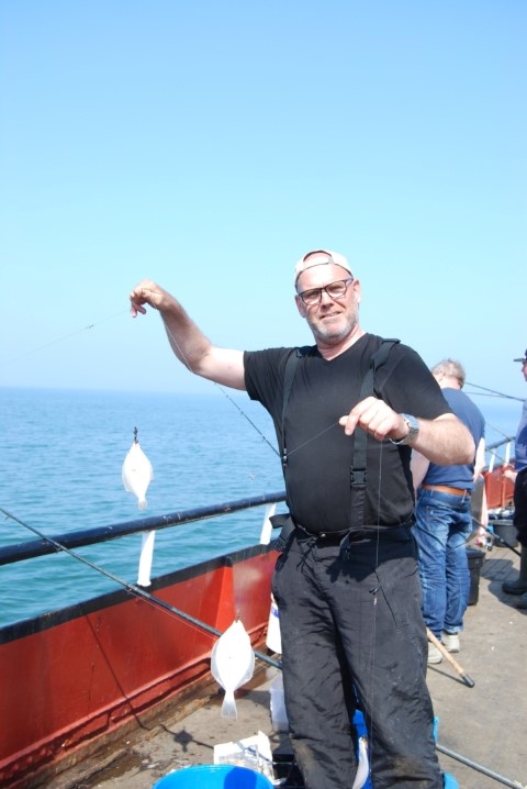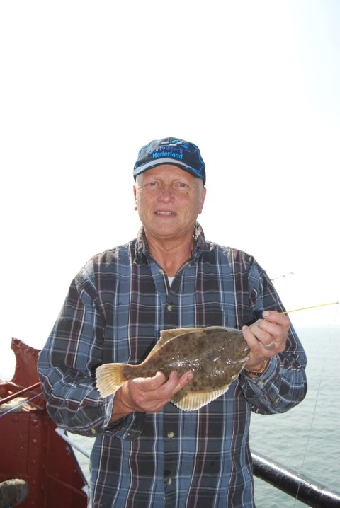 Eric Goossens met een maatse schol Drie vissen voor Bennie van Poortvliet