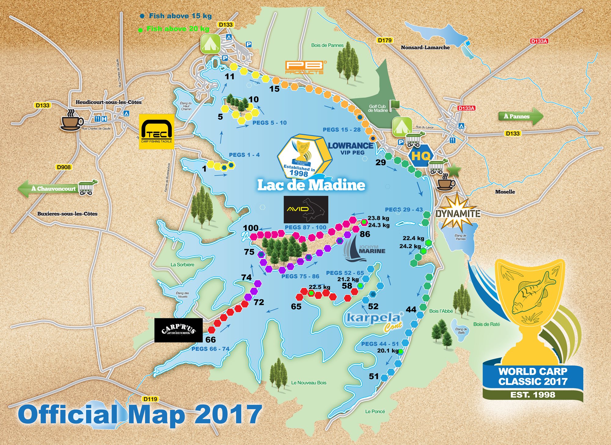 Het Franse 'Lac de Madine' vormt van 11 tot 16 september het strijdtoneel van de World Carp Classic (WCC) 2017. De deelnemers uit 21 landen zijn afgelopen maandag neergestreken op 100 stekken aan dit stuwmeer met een oppervlakte van 1100 hectare. De wedstrijd duurt tot zaterdagochtend en de strijd is spannend! De Nederlandse teams doen het erg goed en bezetten momenteel de eerste drie plaatsen.