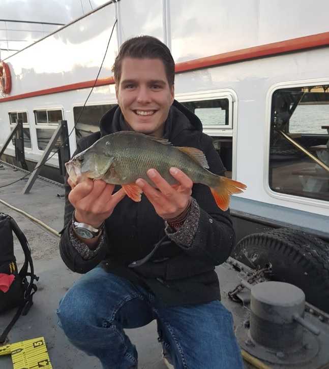 Bjorn Brekelmans is terecht blij met deze mooie baars.