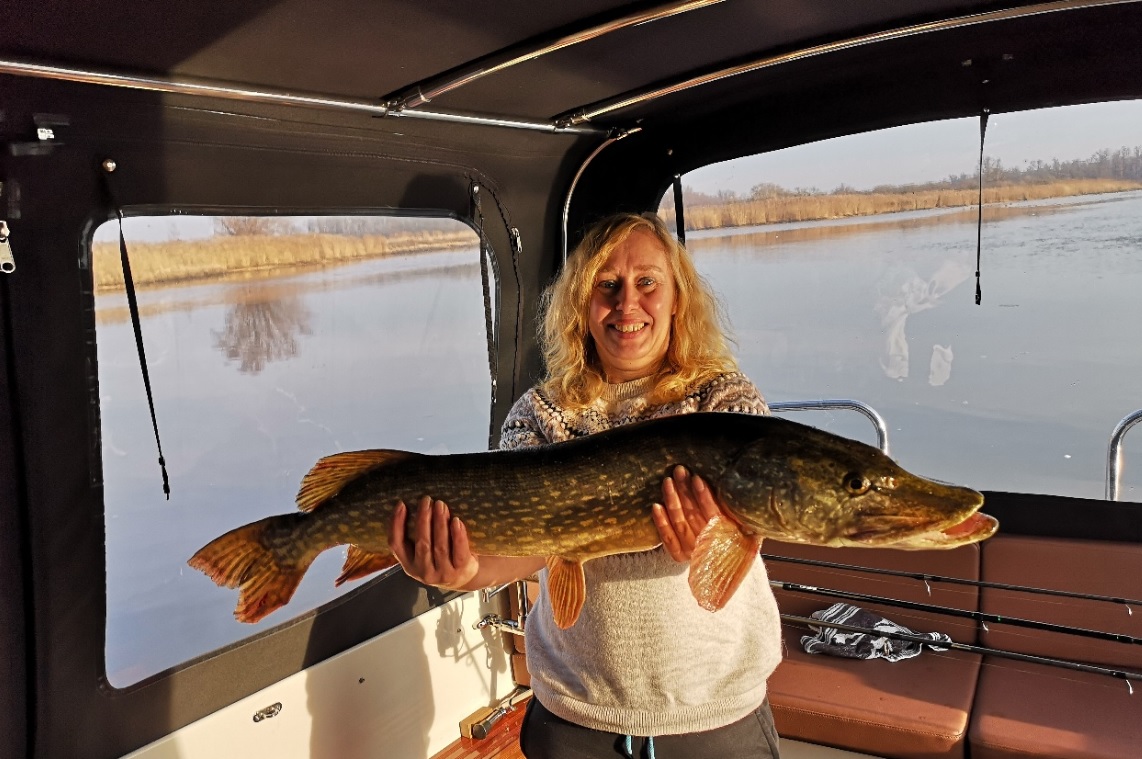 Karin de Jong viste vanuit de boot met doodaas en als beloning kwam deze vette snoek op bezoek.
