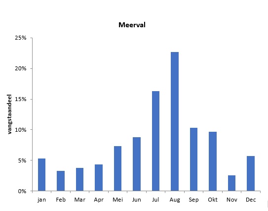 Het vangstaandeel meerval is het grootst in de maanden juli en augustus en daarbij is augustus de absolute topmaand, dus probeer het zeker eens in deze periode. Een warme zomeravond geeft meestal de beste resultaten. Meerval is een echte alleseter en is met vele aassoorten te vangen. De meeste vissers kiezen uit wormen, vismeelpellets, kunstaas of een dode aasvis.