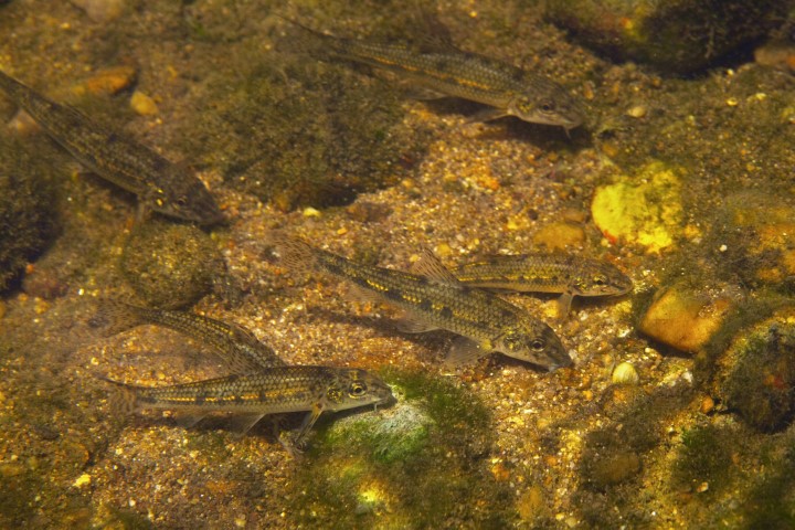 Riviergrondels grondelend in de zandige bodem van een rivier.