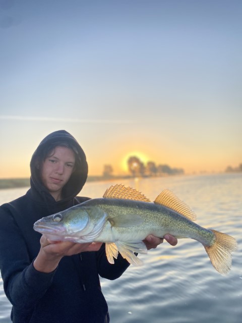 Deze zonsondergang is al spectaculair, maar dat Matthias van der Linden in dit decor mag poseren met deze snoekbaars maakt het plaatje net nóg een stukje mooier.