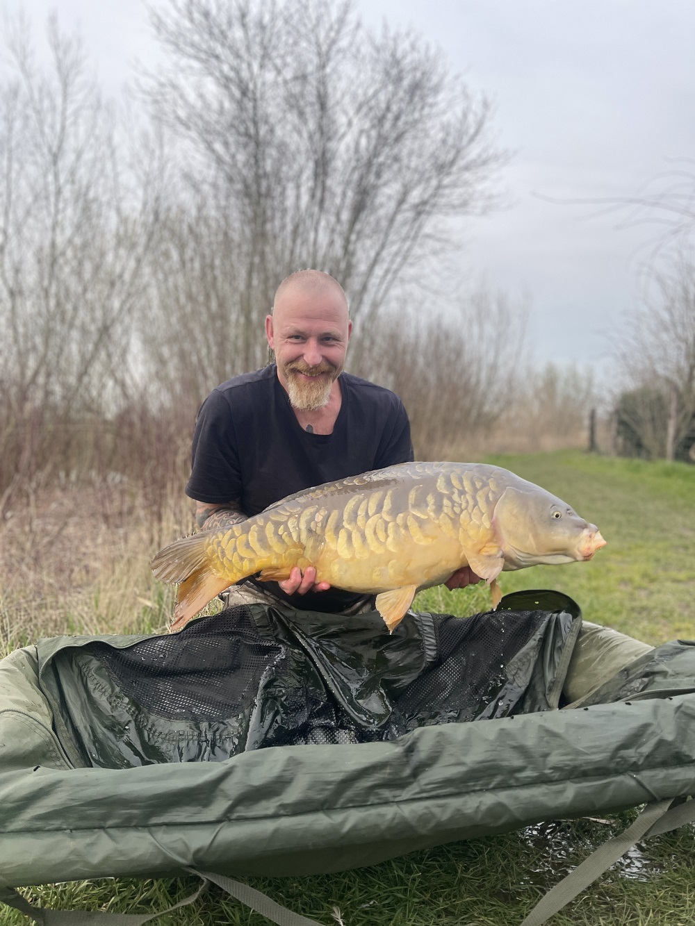 Marc Schreyenberg uit Doetinchem toont een prachtige spiegelkarper van 12,5 kilo. Geen ‘lensdrukker’, maar een foto die mooi het hele decor toont.