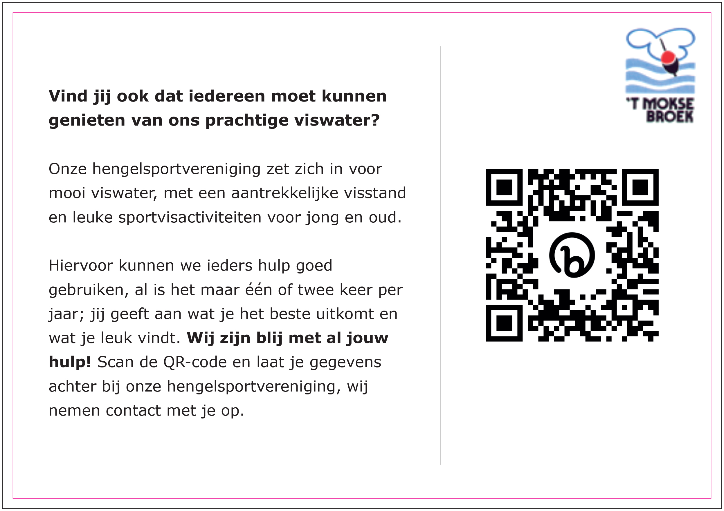 Hiervoor kunnen we ieders hulp goed gebruiken, al is het maar één of twee keer per jaar; jij geeft aan wat je het beste uitkomt en wat je leuk vindt. Wij zijn blij met al jouw hulp! Scan de QR-code en laat je gegevens achter bij onze hengelsportvereniging, wij nemen contact met je op."