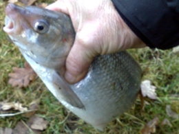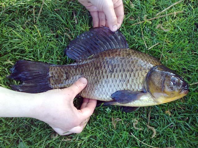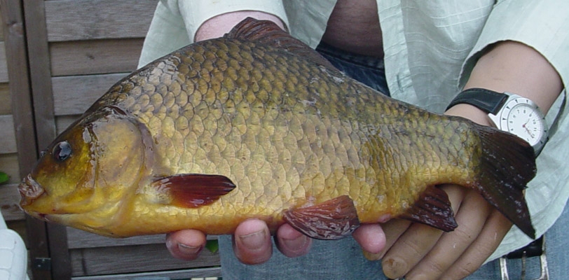 Arjan van Wingerden stuurde ons deze foto van een vis die hij ving in een vijver aan een boilie. Het beest was 30 centimeter lang en leek op een kroeskarper, maar... was het dat ook? Na lang puzzelen komen wij tot de conclusie dat het een hybride is, en wel van een giebel en een kroeskarper.