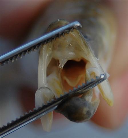 Dat een aalscholver niet kieskeurig is blijkt wel uit het feit dat deze vis naast zijn gezwel ook nog eens wonden heeft die veroorzaakt zijn door aalscholver beten.