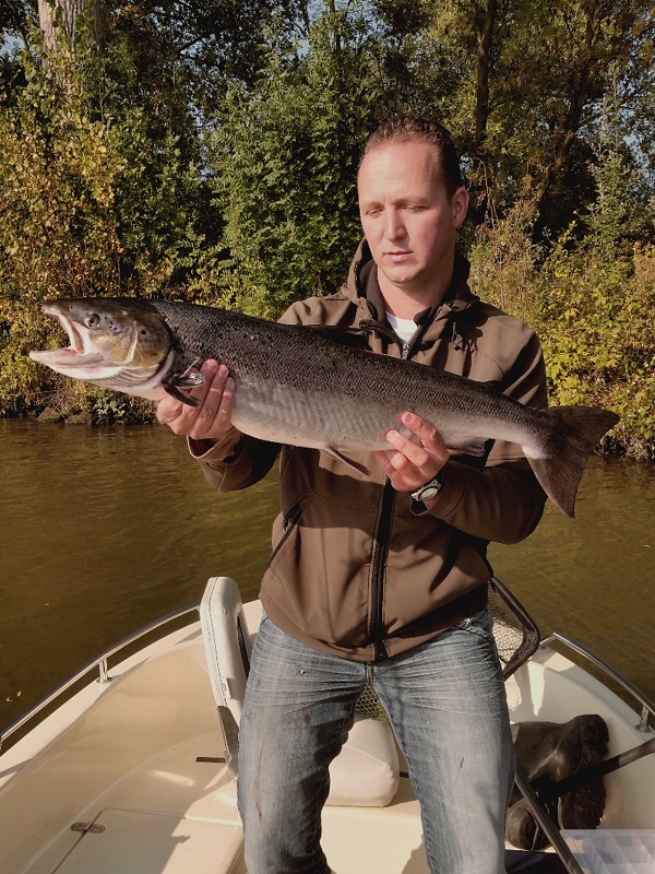 Deze prachtige zalm van precies één meter werd gevangen in de Maas door Ron van Laar. Samen met zijn vismaat Edwin de Wit heeft hij de vis kunnen landen. De zalm zwemt nu weer in de Maas. 23 maart 2015