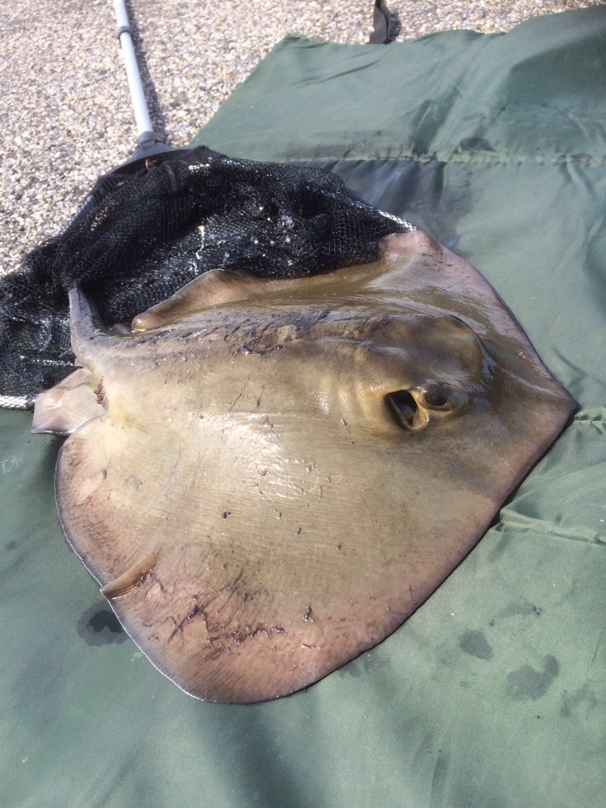 VISmaat Alex Ruijer viste in Zeeland vanaf de kant toen zijn strandsteun omver werd getrokken door een grote vis. Het bleek een pijlstaartrog te zijn van 80 cm!