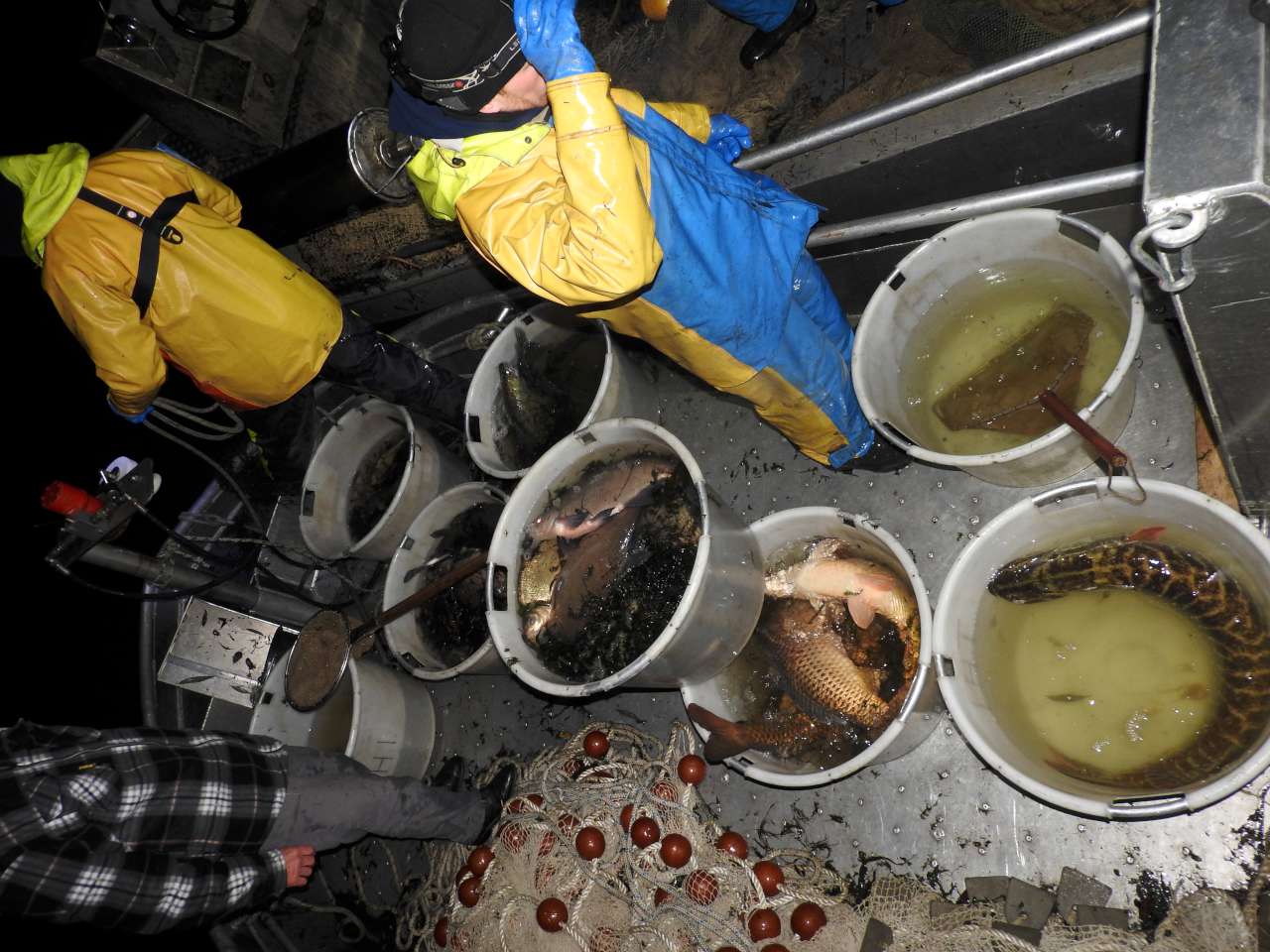 Het is nog even wachten op de rapportage, maar we kunnen in ieder geval melden dat er meer dan twintig verschillende vissoorten zijn gevangen. Zoals verwacht is er veel grote (55 – 65 cm) brasem boven water gekomen. Echter, naast grote brasems is er opvallend veel blankvoorn gevangen en was de variatie in roofvis (baars, snoek en snoekbaars) groot. “Deze visuele waarnemingen passen bij onze verwachtingen, namelijk dat het Volkerak-Zoommeer de laatste decennia veranderd is van een brasem-snoekbaars in de richting van een snoek-blankvoorn viswatertype”, aldus Emiel Derks (Adjunct directeur van Sportvisserij Zuidwest Nederland). Het overgrote deel van de gevangen vis was in uitstekende conditie. Uiteraard is alle gevangen vis is na het meten en wegen weer levend teruggezet.