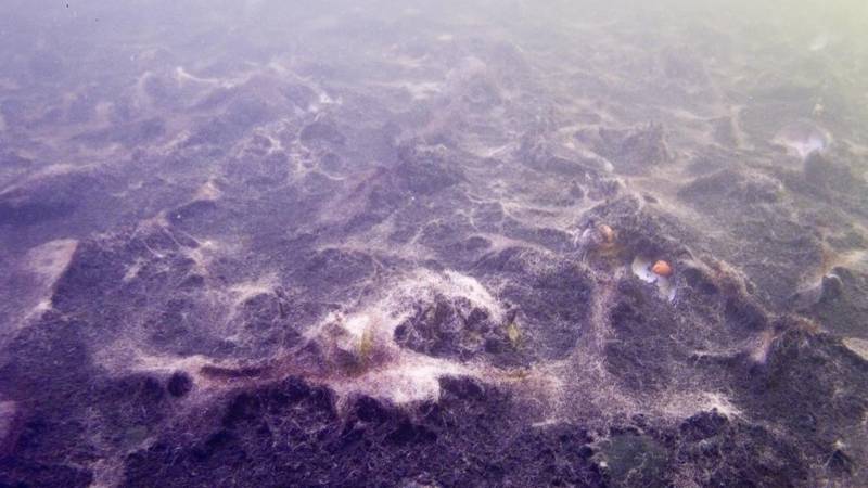 Witte matten van bacteriën op de bodem van het Grevelingenmeer (foto: Rijkswaterstaat)
