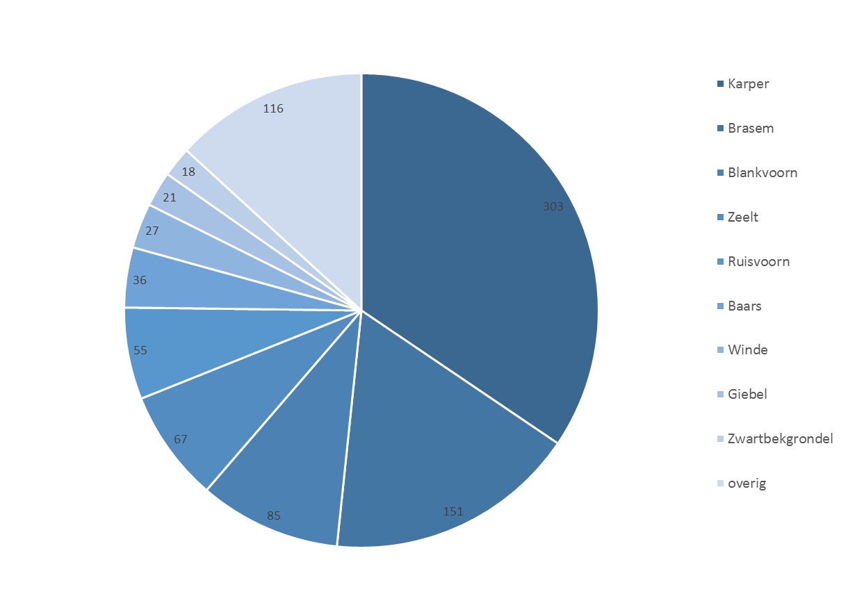 Tijdens de Week van Ons Water zijn er in MijnVISmaat door 312 gebruikers, 879 vissen (38 verschillende soorten) geregistreerd, verspreid over 415 verschillende locaties in ons land. Onderstaande diagram geeft de verdeling weer van de meest gevangen vissoorten.