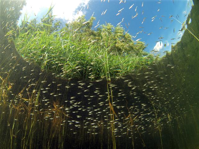 Duizenden visdiefjes, kluten en wat dies meer zij, besloten maar vast hun nageslacht op de eilanden in aanleg groot te brengen. Dat deed het natuurfilmershart in me goed. Maar nog imposanter vond ik de enorme hoeveelheid insecten die er opdoken. Gigantische massa’s dansmuggen zweefden er al over de eilanden. Ook onder water gebeurt er veel.