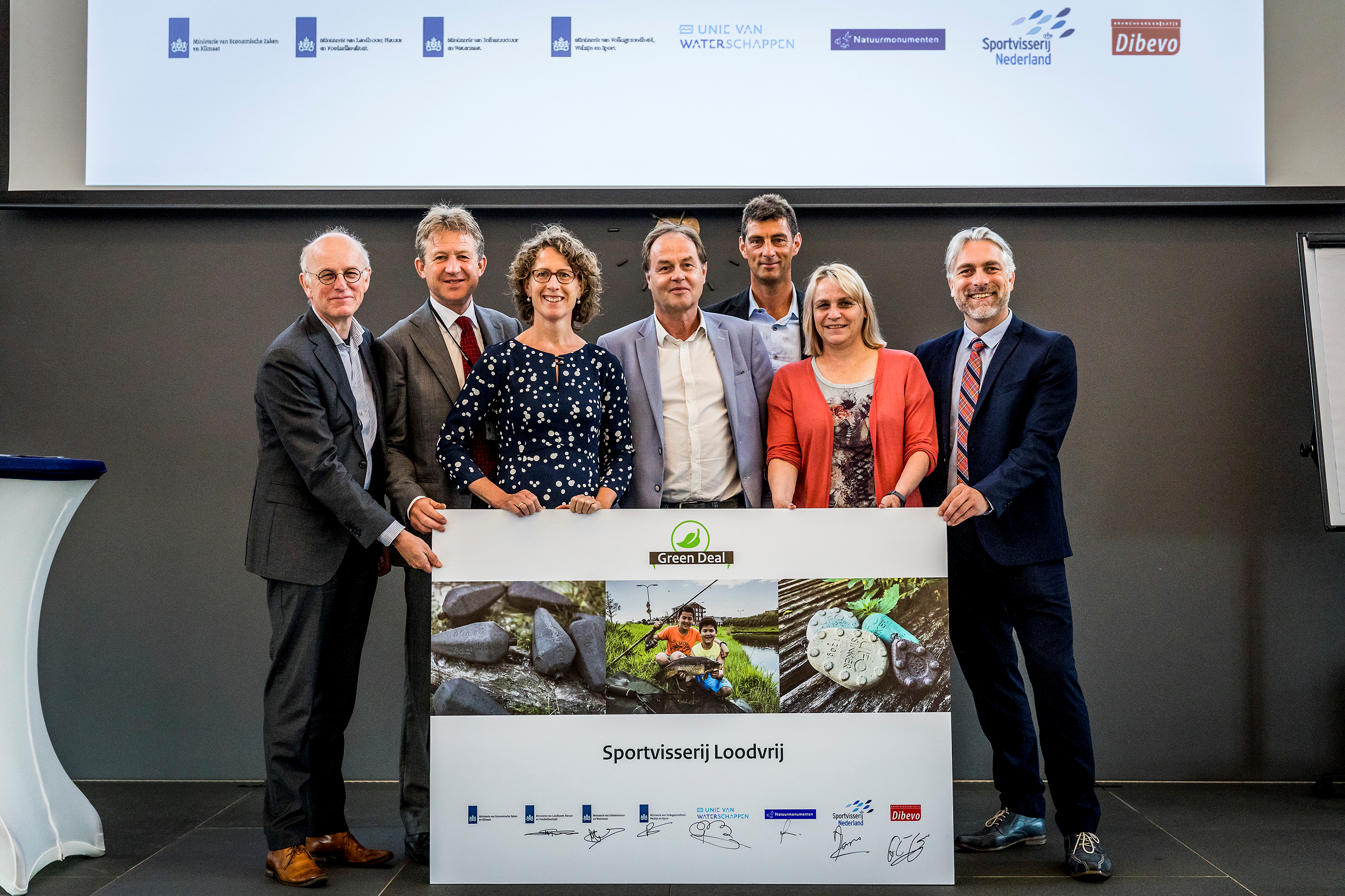 De ondertekening van de Green Deal, met in het midden Joop Bongers - directeur Sportvisserij Nederland.