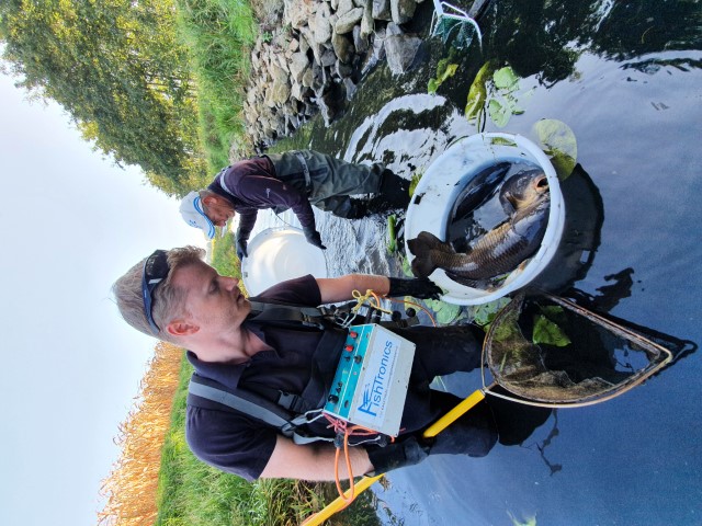 Met het elektrovisapparaat worden de laatste grote vissen uit een poel gevangen en overgebracht naar een nabijgelegen, veilig water.