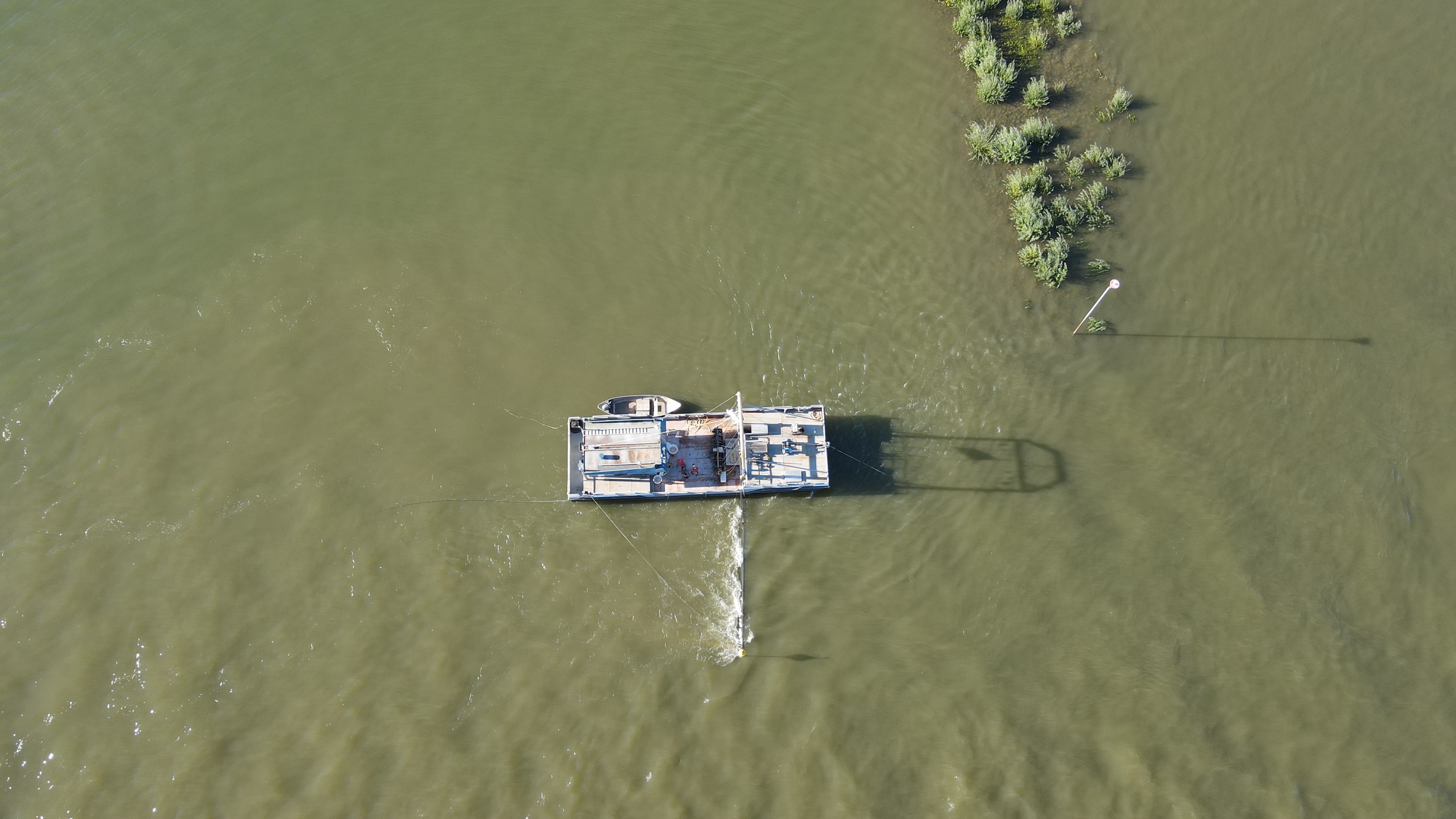 Ankerkuilen: de boot ligt voor anker en de het net vist aan de zijarm in de stroming.
