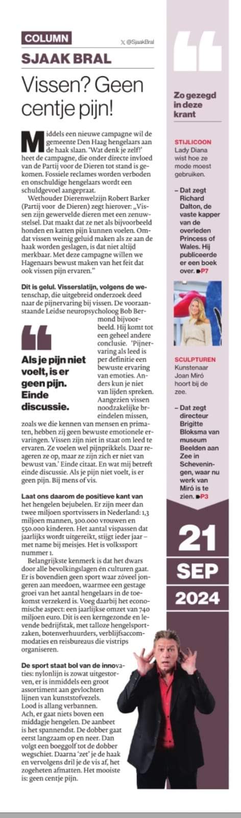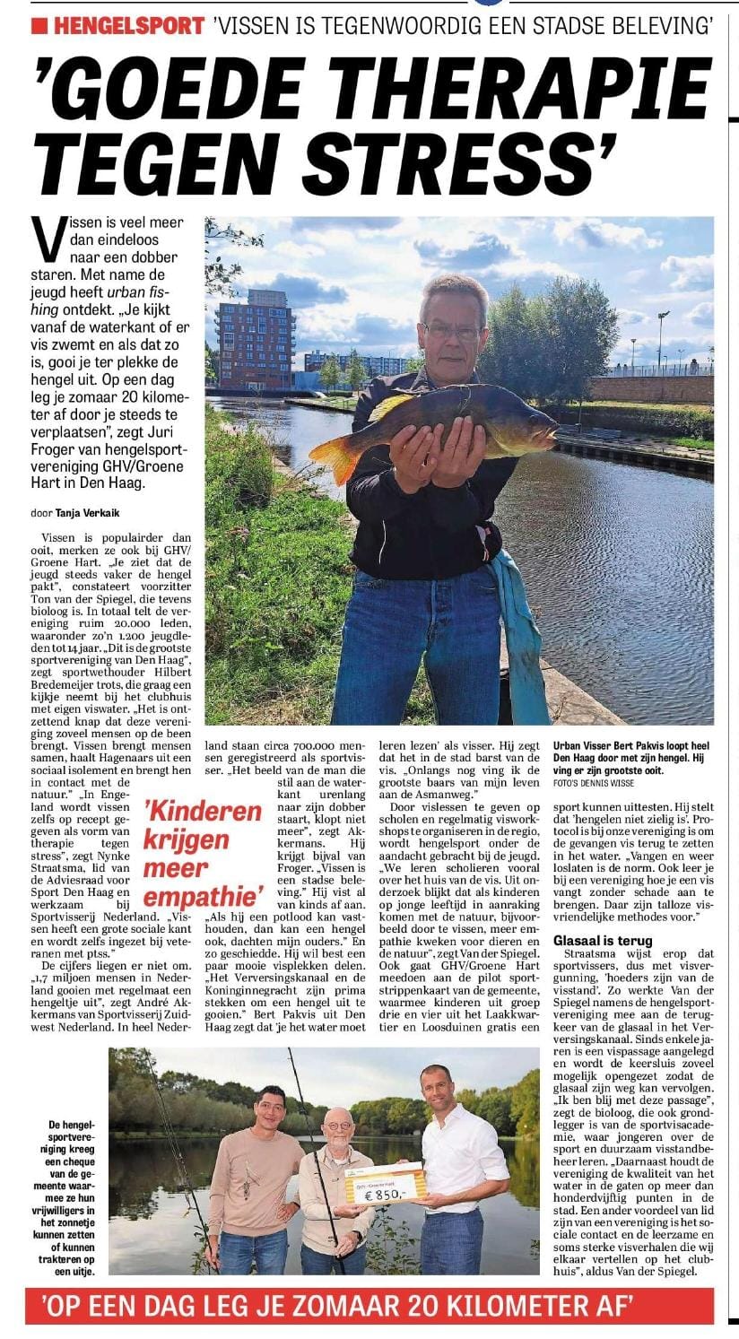 Sportvissen biedt meer dan alleen vis vangen. Ontspanning, sociale contacten, het genieten van de natuur en het vinden van rust in een druk leven; het zijn redenen voor ruim 20.000 leden van Hengelsportvereniging GHV – Groene Hart om regelmatig naar de waterkant te gaan. Dat en meer staat in het artikel ‘Vissen is tegenwoordig een stadse beleving; een goede therapie tegen stress’ in de Telegraaf van donderdag 31 oktober.