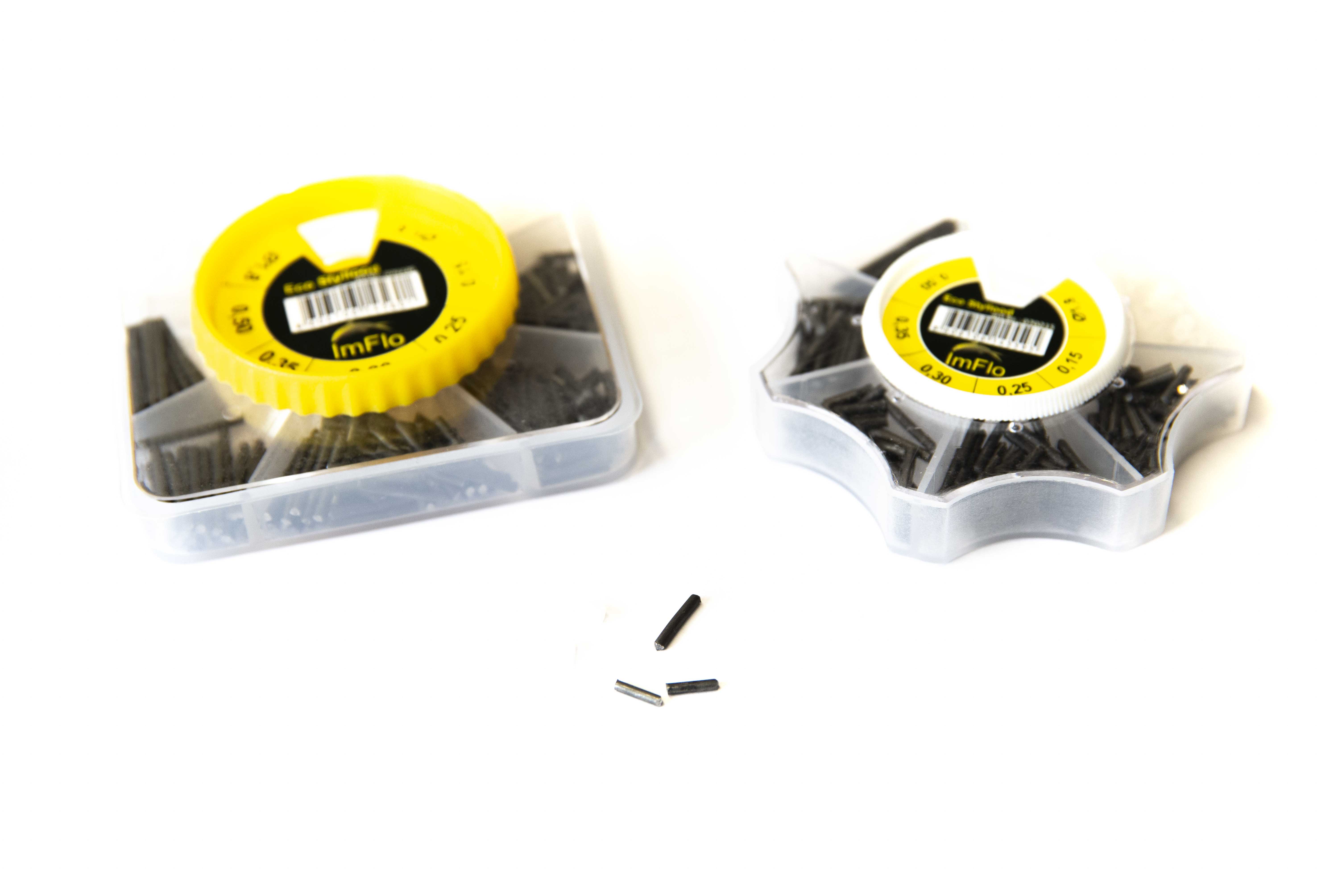 Loodvrije verdelers van ImFlo. Eindelijk een goed loodvrij alternatief voor de zogenaamde split shots. Kleine ijzeren staafjes die door middel van een rubberen tube op de lijn gezet kunnen worden.