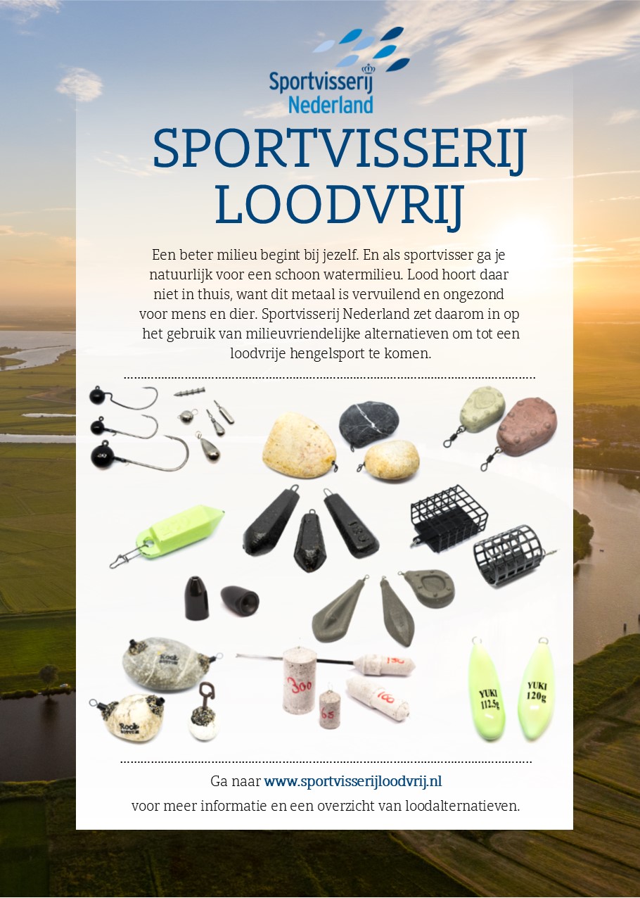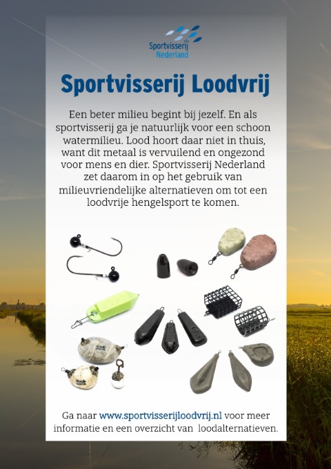Bovenstaande digitale leaflet is gratis als papieren flyers op A5-formaat te ontvangen voor evenementen of in clubgebouwen. Ook is het onderstaande Sportvisserij Loodvrij poster op A2-formaat gratis te verkrijgen. Daarnaast heeft Sportvisserij Nederland voor beurzen en andere evenementen setjes showmodellen van loodvervangers en rolbanners van Sportvisserij Loodvrij te leen. Daarnaast kunnen Sportvisserij Nederland en je federatie je vereniging ondersteunen bij de aanschaf van milieuvriendelijke loodalternatieven.