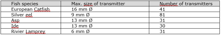 1. 214 Acoustic Transmitters: - A total of 214 unique transmitters in different types, specified for the fish species catfish, silvereel, asp, ide and river lamprey (see table below).