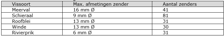 1. 214 akoestische zenders: - In totaal 214 unieke zenders in verschillende typen afgestemd op de vissoorten meerval, schieraal, roofblei, winde en rivierprik (zie onderstaande tabel).