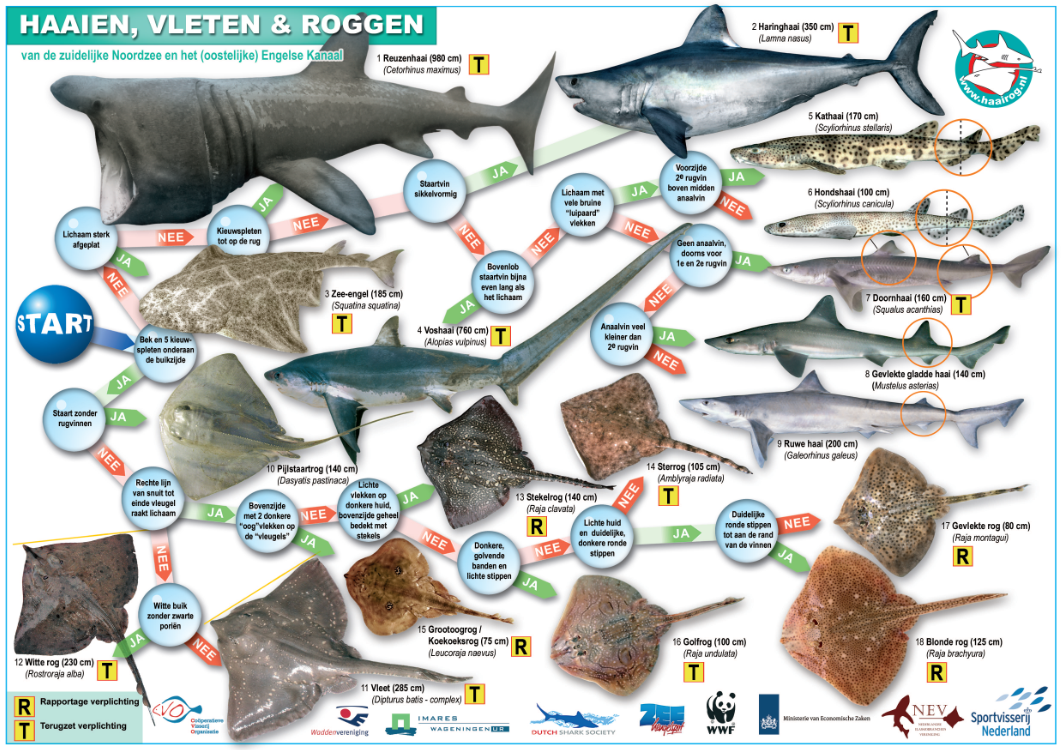| Sportvisserij Nederland roept alle beroeps- en sportvissers op om elke gevangen haai, vleet of rog weer levend terug te zetten. Haaien vleten en roggen hebben vrijwel geen economische waarde en zijn dus niet de moeite waard om aan te landen. De gevlekte gladde haai is ook nog eens niet lekker om te eten. Sommige van deze haaien, vleten en roggen zijn zeer zeldzaam en zijn beschermd door de wet. Een 'T' op de zoekkaart betekent dat de vis altijd levend en onbeschadigd vrijgelaten moet worden volgens de wet. Organisaties werkend aan herstel De informatie op deze identificatie/zoekkaart is opgeschreven in samenwerking met verschillende mariene organisaties die een belang hebben bij de bescherming van deze zeldzame vissoorten. Zoals beroepsvisserij organisaties, het mariene onderzoeksinstituut WMR, Stichting de Noordzee, Vereniging Kust & Zee, en het Ministerie van LNV. | Meer informatie?  dhr. Niels Brevé mail |