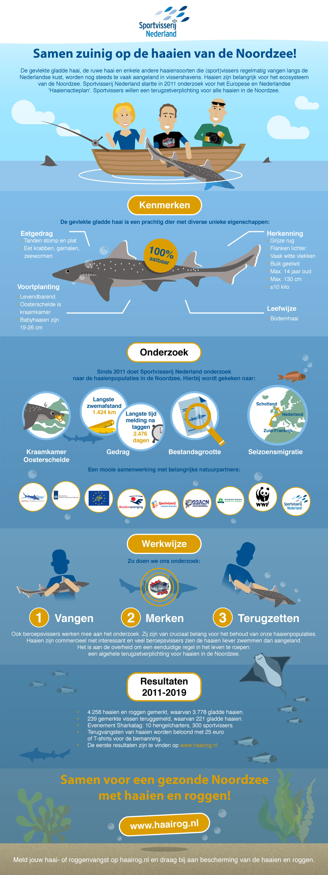 Sinds 2011 doet Sportvisserij Nederland onderzoek naar de haaienpopulaties in de Noordzee. Hierbij wordt gekeken naar het gedrag, de bestandsgrootte en seizoensmigratie. Haaien worden gevangen, gemerkt en weer teruggezet.