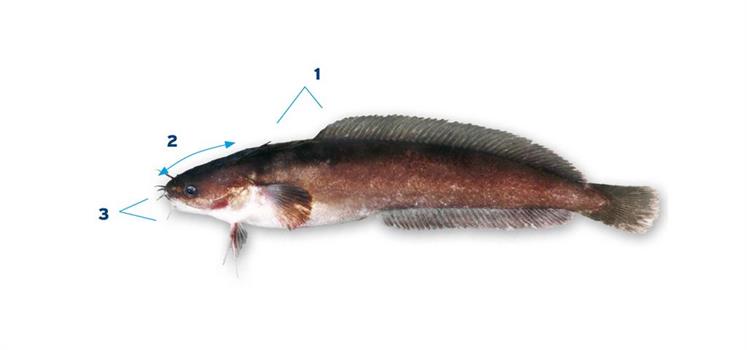 Herkenning: 1. Twee rugvinnen, de eerste met één normale vinstraal, gevolgd door een rij zeer korte vinstralen in een groef en de tweede met 45-56 normale vinstralen. 2. Kop kort, minder dan 1/5 van de totale lengte. 3. Eén draad op de kin en vier bovenop de snuit.