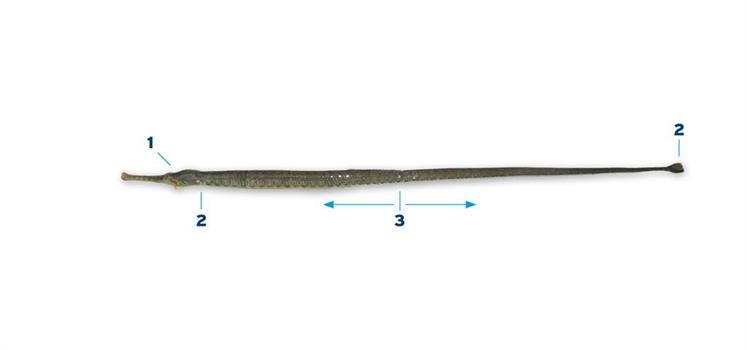 Herkenning: 1. Snuit buisvormig, langer dan de halve koplengte en met kleine eindstandige bek. 2. Langwerpig, slangachtig lichaam met benige lichaamsringen, volwassen dieren met donkere dwarsbanden. Borstvinnen en staartvin aanwezig. 3. 17-21 ringen vóór de anaalopening, 39-43 ringen achter de anaalopening (tellen bij kleine dieren noodzakelijk om verwarring met kleine zeenaald uit te sluiten!).