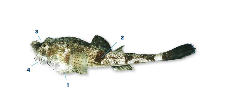 Herkenning: 1. Buikvinnen ieder met maximaal vier vinstralen. 2. Lichaam met gekielde beenplaatjes, bruin met vier of vijf donkere dwarsbanden. 3. Grote kop met vier grotere stekels op bovenkant snuit. 4. Onderkant kop met veel korte draden.