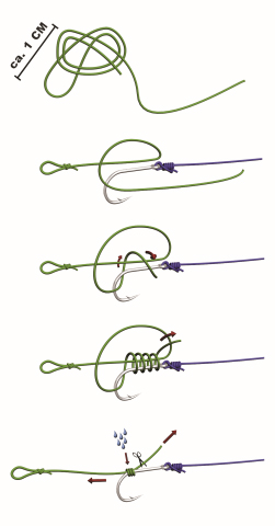 Goede knopen zijn heel belangrijk. In dit onderdeel leer je hoe je met de halve bloedknoop een haak stevig aan de lijn bevestigt. Vervolgens kun je het aas op je haak prikken of eventueel aan een hair bevestigen. De hair zet je met een eenvoudig knoopje vast aan je haaksteel.