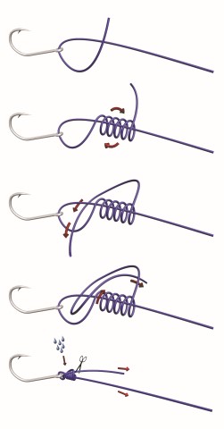 1. Steek het uiteinde van de lijn door het oog van de haak en laat het circa 10 centimeter uitsteken. 2. Wikkel het uiteinde van de lijn vijf keer om de hoofdlijn. 3. Haal het uiteinde van de lijn door de lus boven het haakoog. 4. Steek dan het uiteinde van de lijn door de lus boven de wikkeling. 5. Bevochtig de knoop met wat speeksel en trek hem aan. Knip het uiteinde af.
