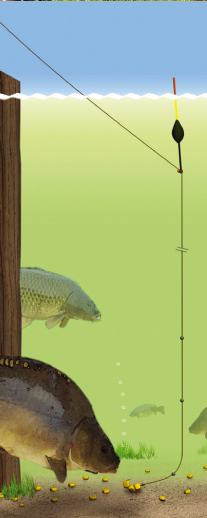 1. Als voorbeeld gebruiken we mais uit blik. Rijg meerdere korrels mais op de aasnaald of boilienaald. 2. Sla het lusje van de hair om de weerhaak van de naald. Schuif dan met je vingers de korrels op de hair. 3. Steek een plastic stoppertje door het lusje. Deze stoppertjes zijn in allerlei soorten en maten te koop. 4. Trek de mais tegen het stoppertje. Een vingerdikte ruimte tussen aas en haak is goed. De haak blijft volledig vrij en kan dus perfect in de karperbek prikken.
