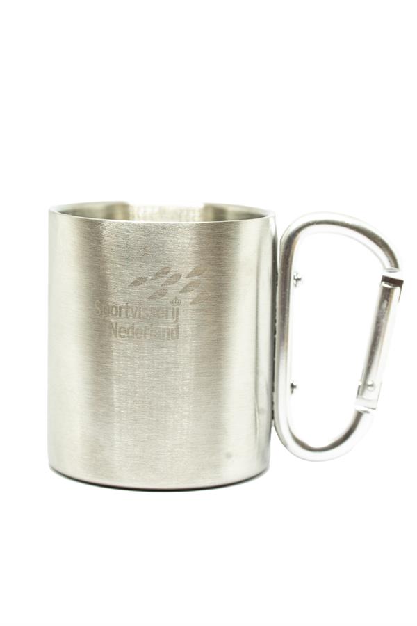 Het Sportvisserij Nederland-logo is via 'laser gravering' bedrukt, waardoor het ook na talloze wasbeurten mooi en duidelijk zichtbaar blijft. Dankzij de handige karabijnhaak kun je de outdoor mok heel eenvoudig aan je vistas of -rugzak hangen en neemt hij geen ruimte in je tas in beslag.