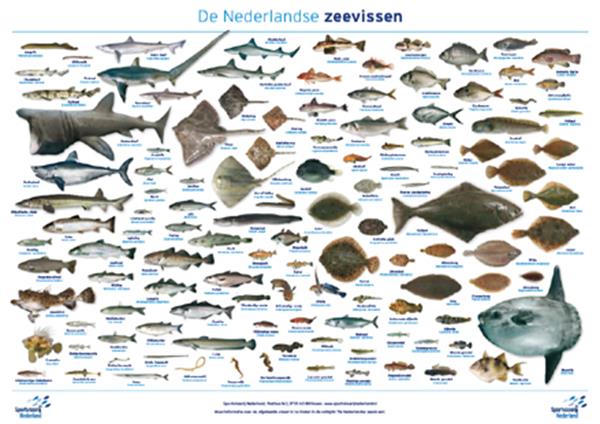 Op de miniposter “De Nederlandse zeevissen” van 59 x 42 cm (A2 formaat) vind je alle 119 vissoorten (‘van Ansjovis tot Zeeduivel’) die in het Nederlandse kustgebied voorkomen of die door Nederlandse beroepsvissers regelmatig uit de Noordzee worden aangevoerd en vervolgens te vinden zijn in de vishandel.