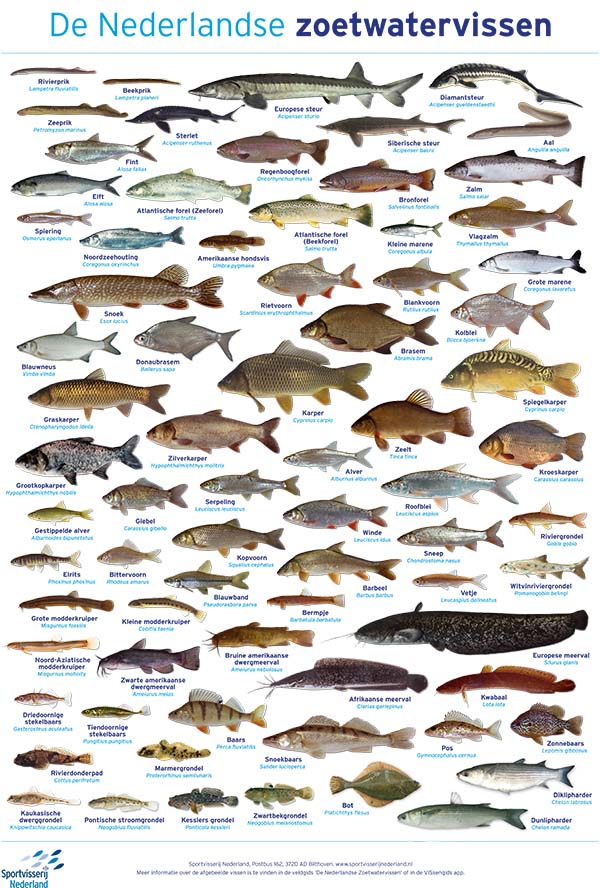 Op de miniposter “De Nederlandse zoetwatervissen” van 42 x 30 cm (A3 formaat) vind je alle 72 vissoorten (‘van Aal tot Zeelt’), die je in het Nederlandse binnenwater kunt aantreffen.