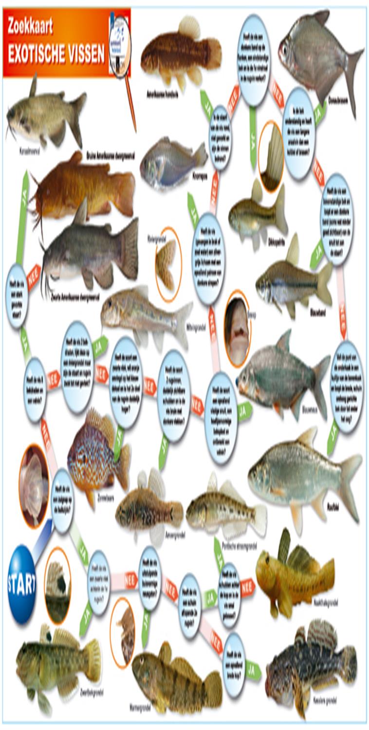 In samenwerking met het Ministerie van LNV en stichting RAVON is vervolgens de zoekkaart exotische vissen gemaakt. Op de zoekkaart staan zestien soorten die vanuit het ministerie van LNV extra aandacht vereisen. Met dit handige hulpmiddel zijn alle sportvissers, schepnetters en andere in vis geïnteresseerden vanaf nu in staat om deze vissen op naam te brengen.